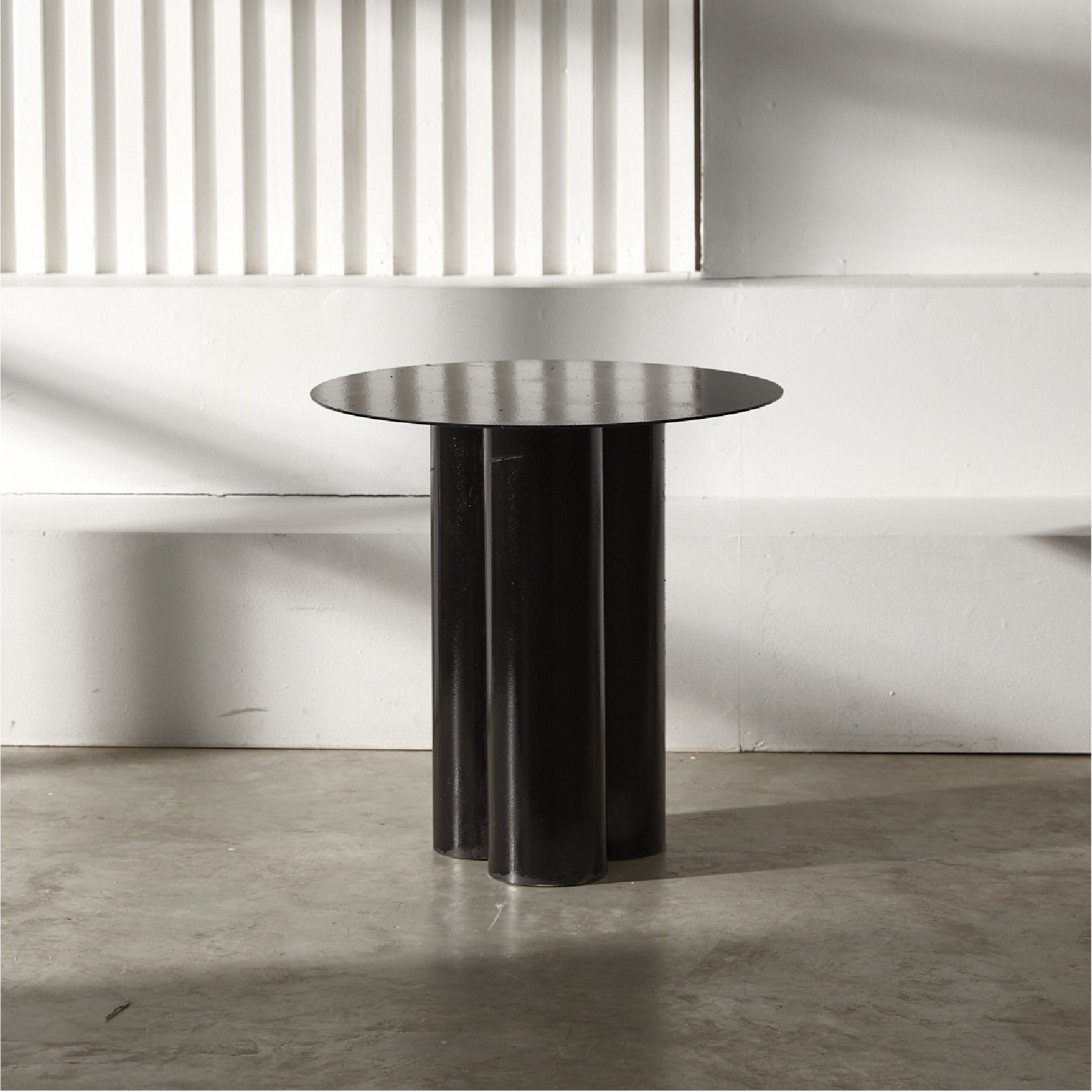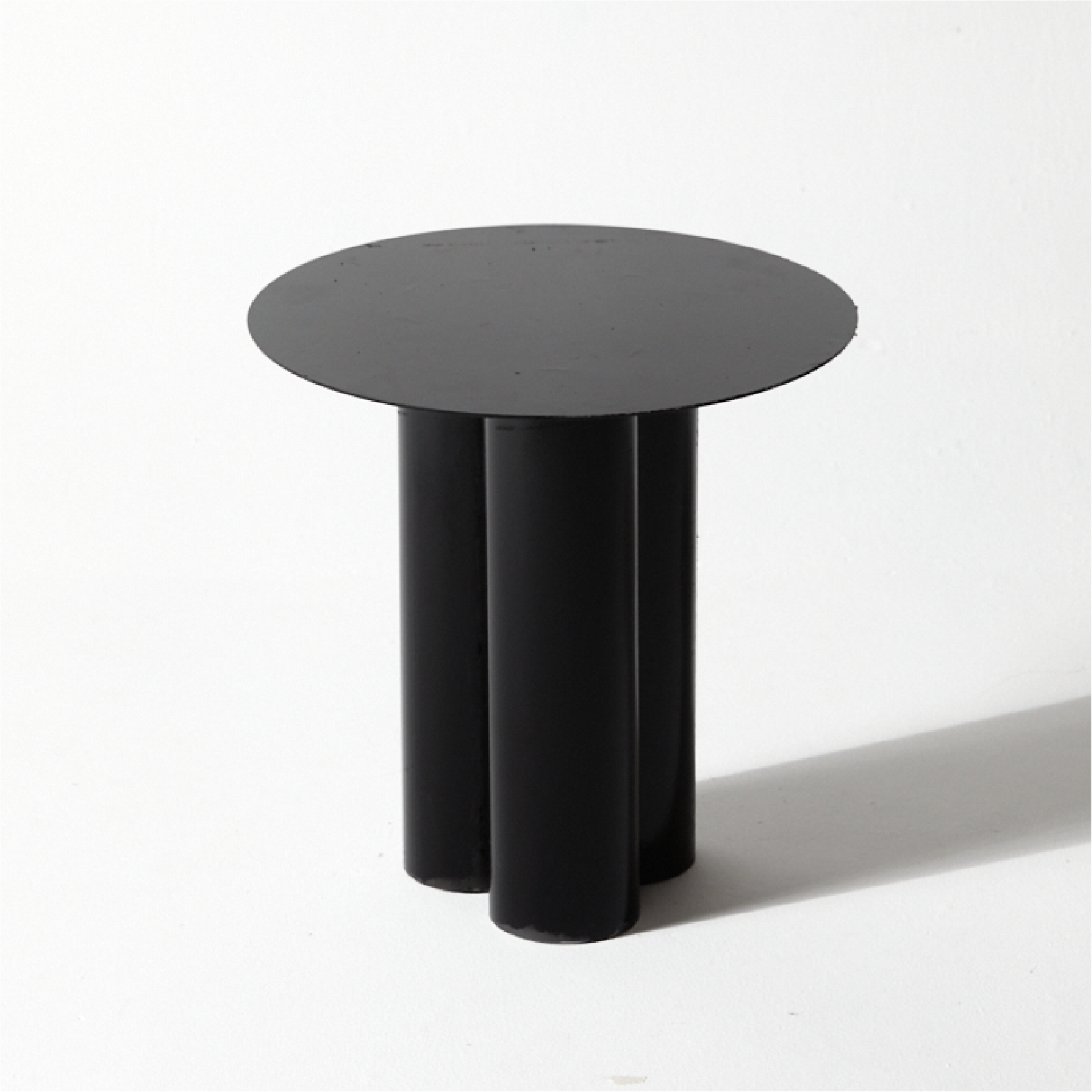 Mesa metálica recubierta en pintura electroestática, superficie en lámina y base de tres cilindros. Diámetro de 40 cm. Ideal como auxiliar en salas o como complemento. Altura de base a superficie: 45 cm.