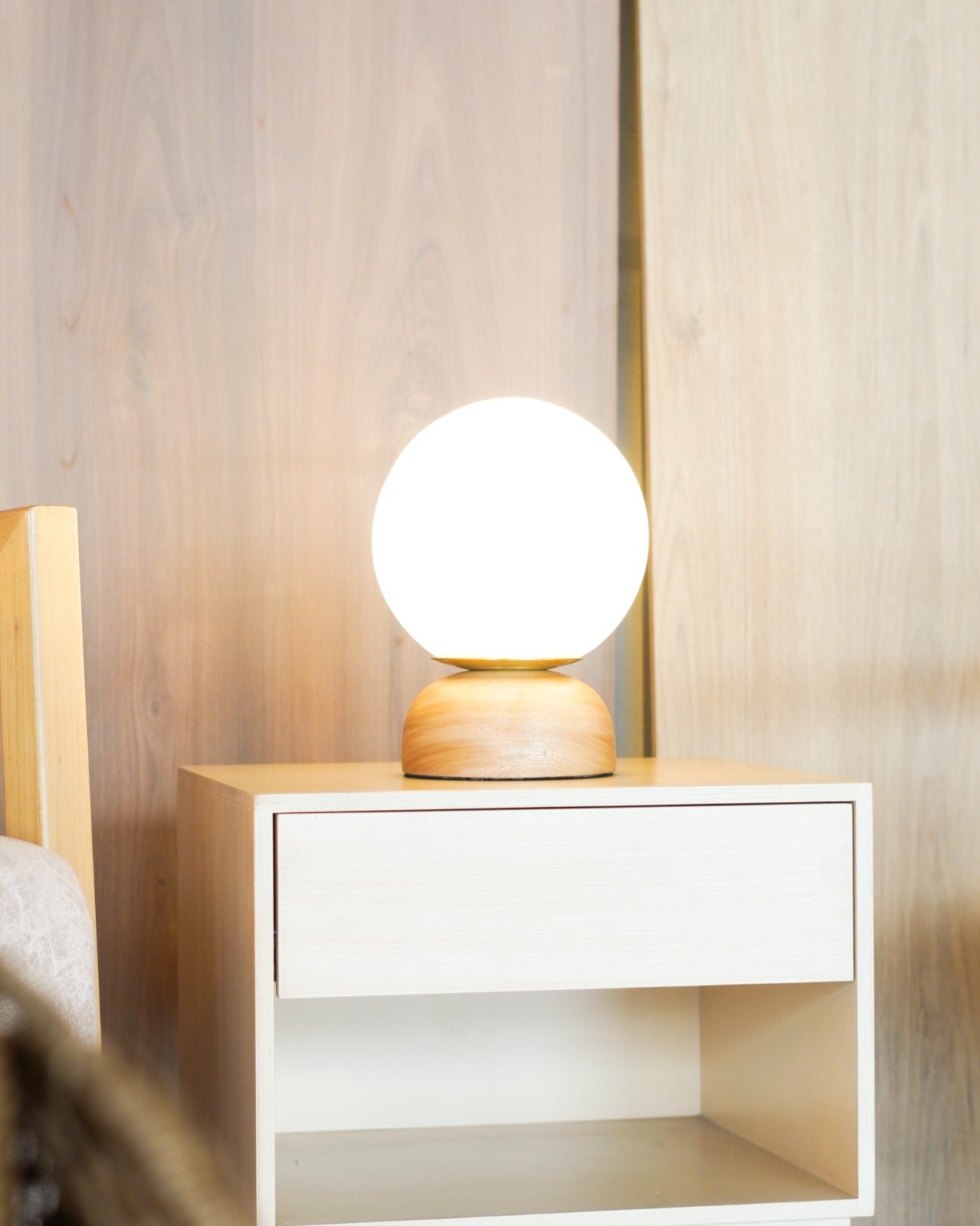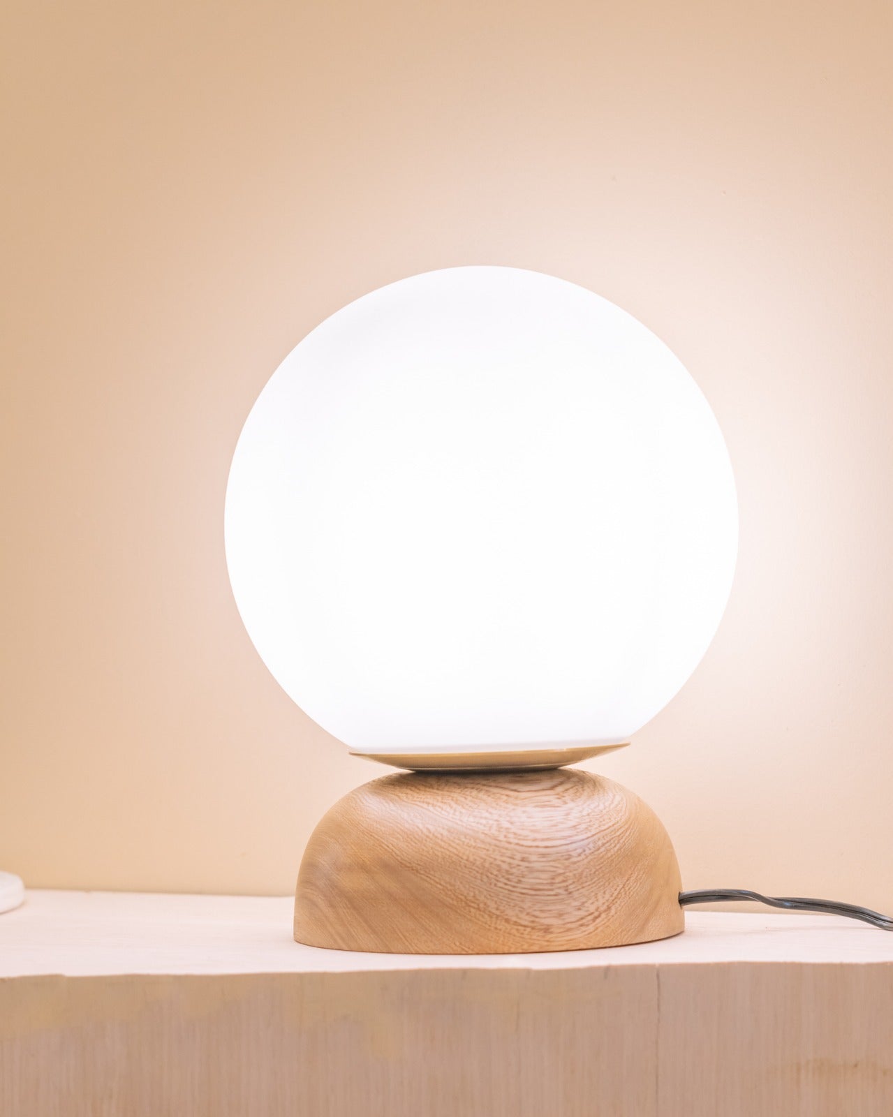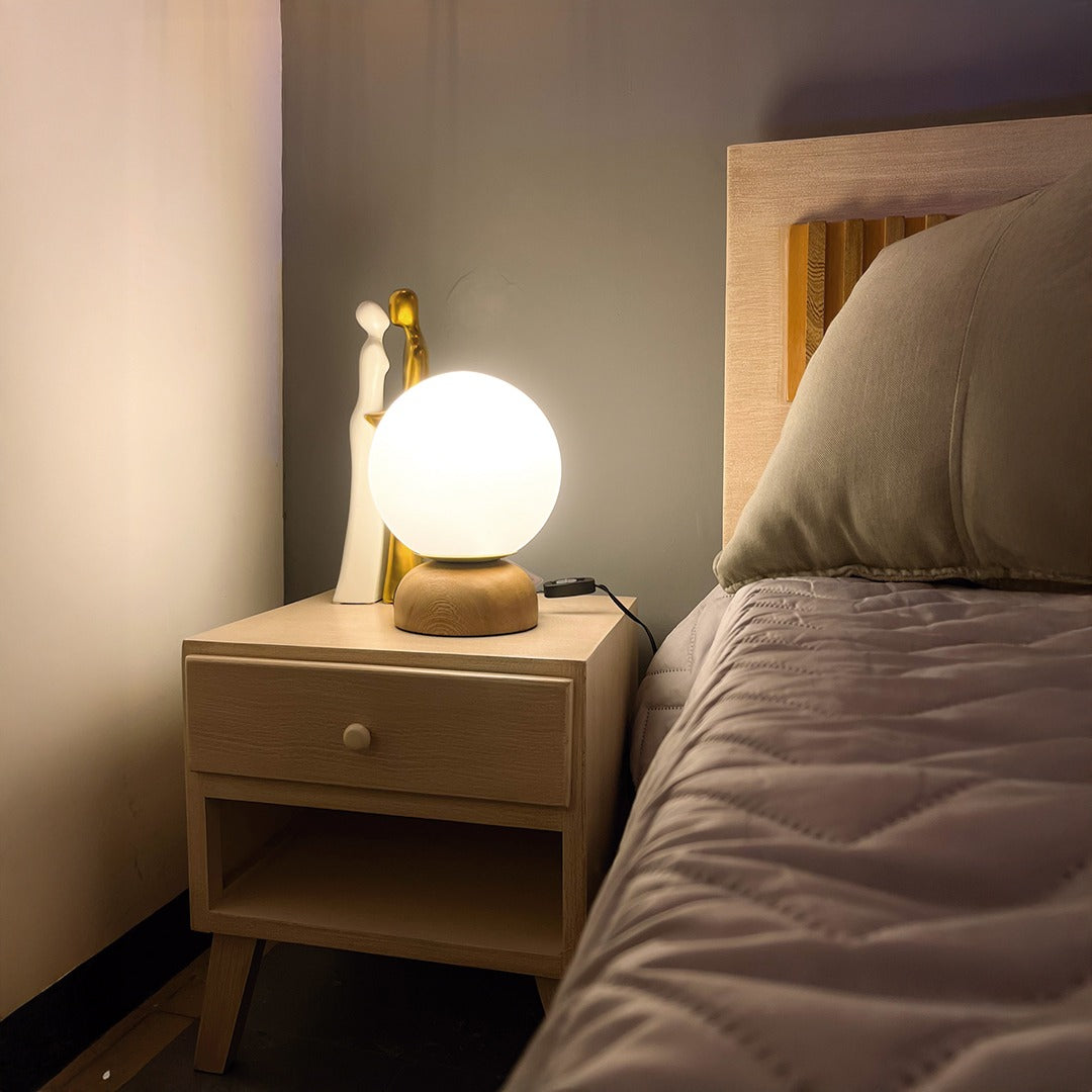 Fabricada en madera y su bomba color pastel le dan el toque sobrio y moderno. Se puede utilizar un interruptor en el cable para encenderla y apagarla cómodamente. La lámpara de sobremesa se adapta a la perfección en estilos de decoración modernos. Acabado en roble nautal semi mate