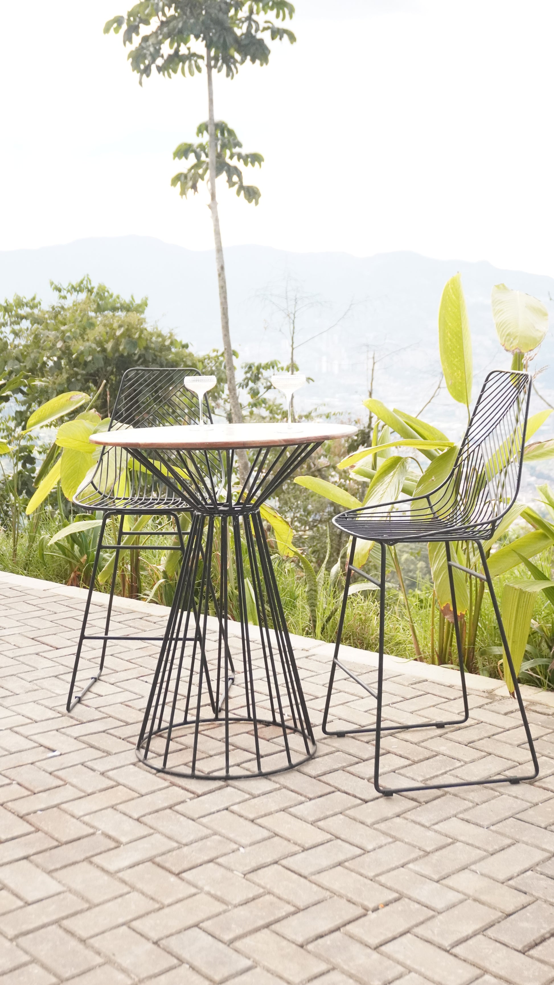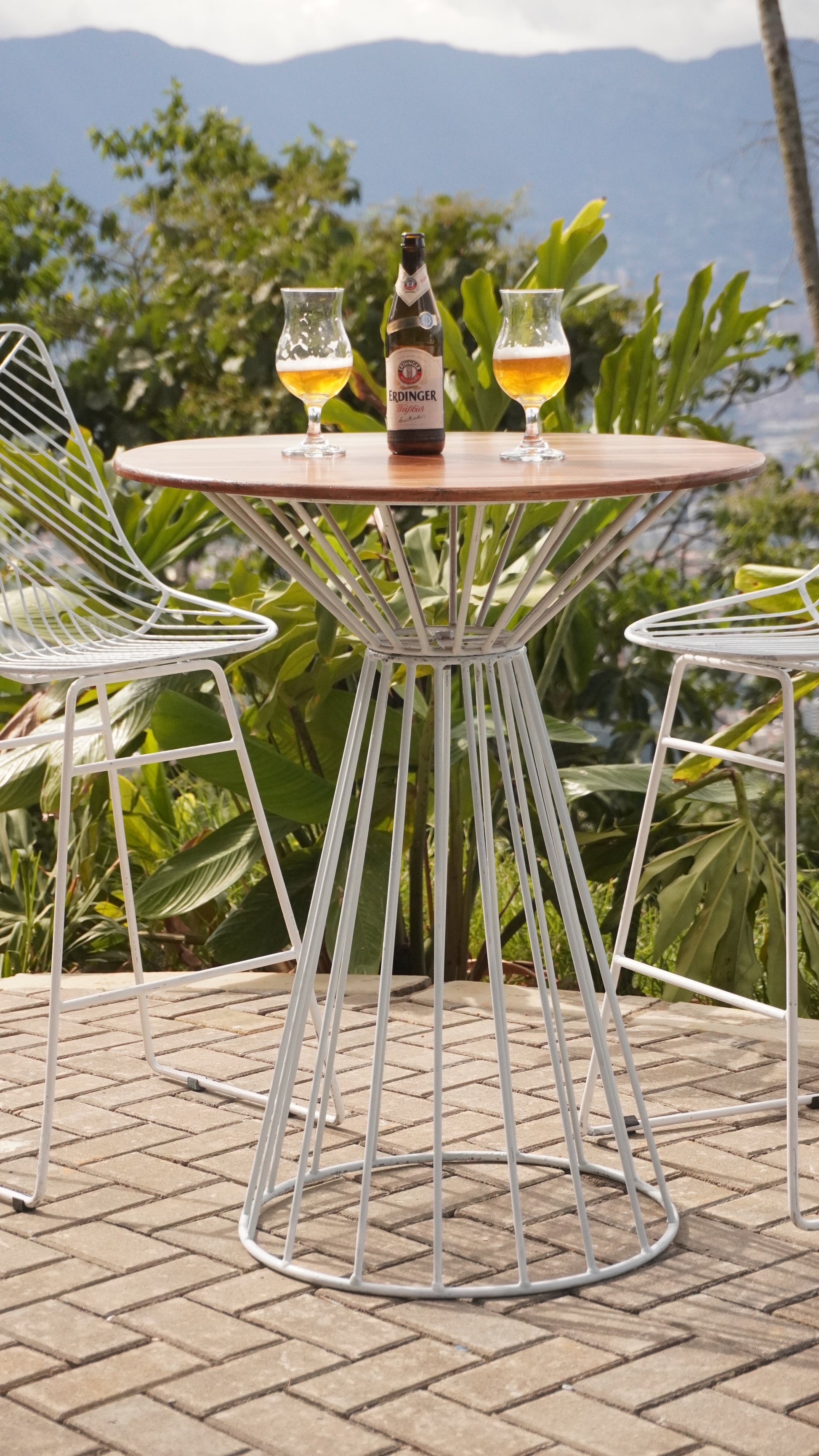 Mesa alta para interior o exterior, ideal para generar ambientes de recreacion y socializacion, con superficie en madera teca.