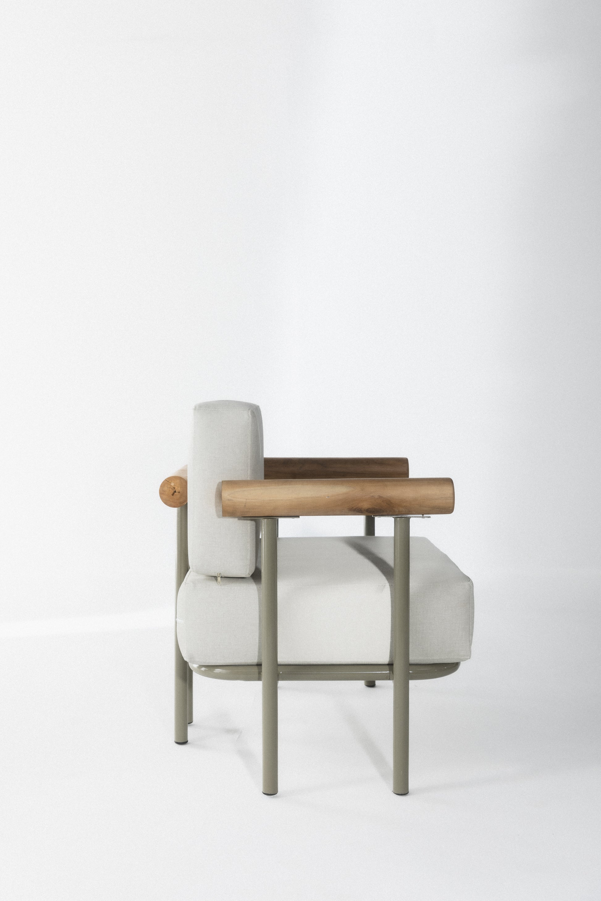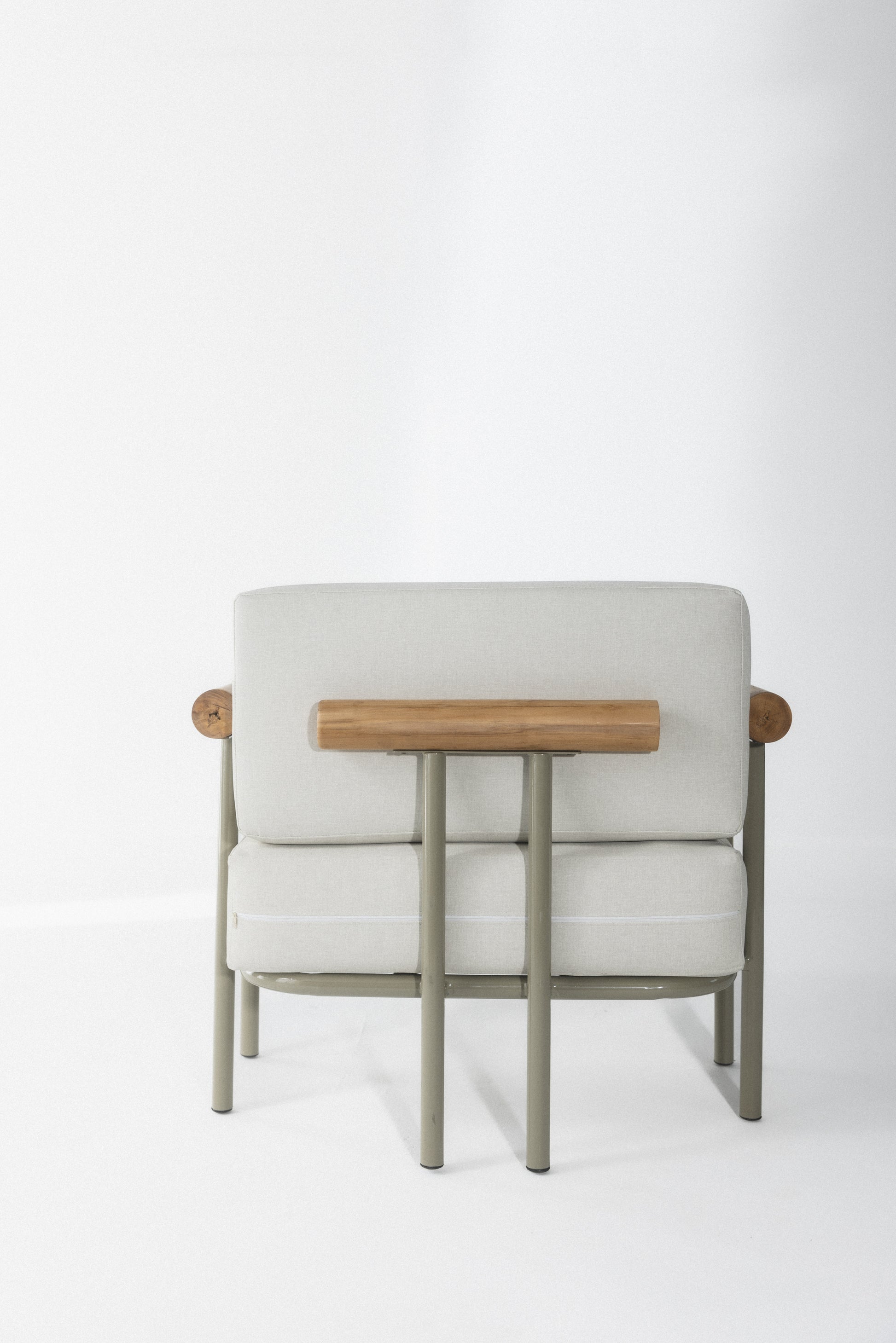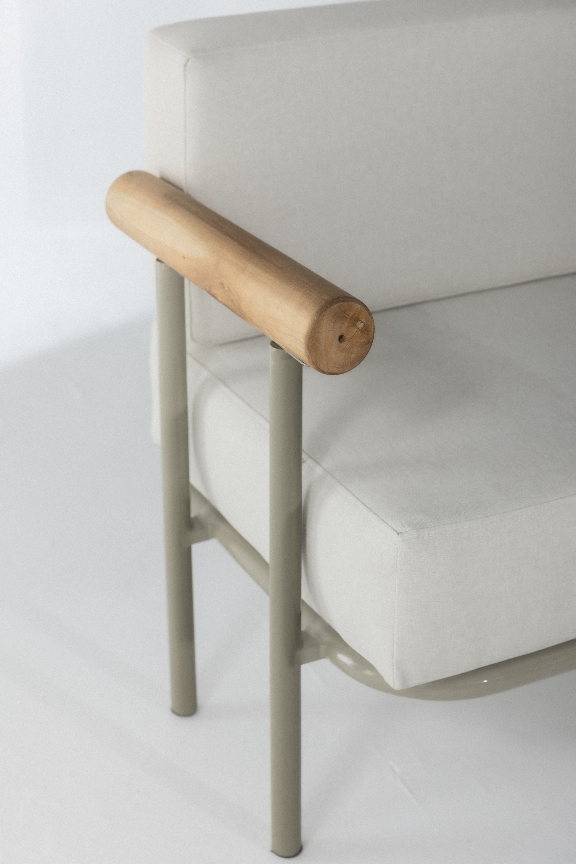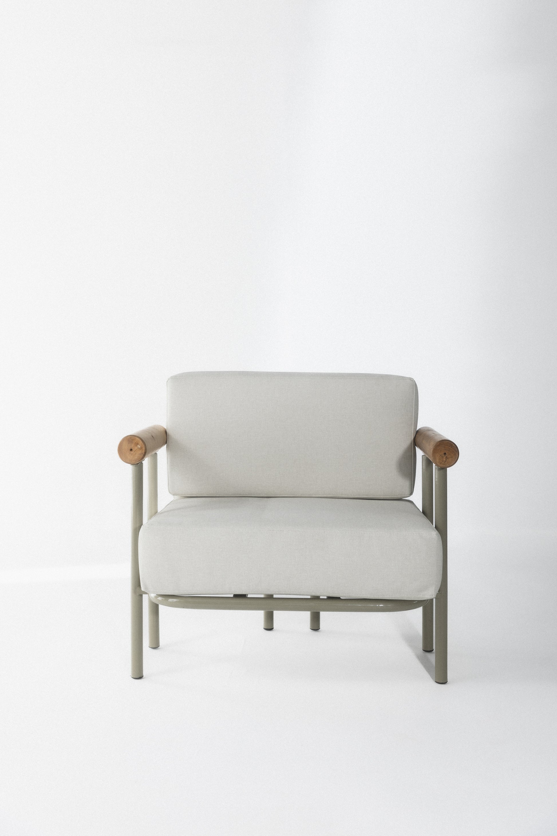 Esta poltrona para exterior combina un diseño sofisticado con materiales resistentes, perfecta para disfrutar de la comodidad en jardines, terrazas, patios o balcones. Su estructura sólida y sus brazos en madera teca aportan un estilo cálido y acogedor, ideal para cualquier espacio al aire libre.