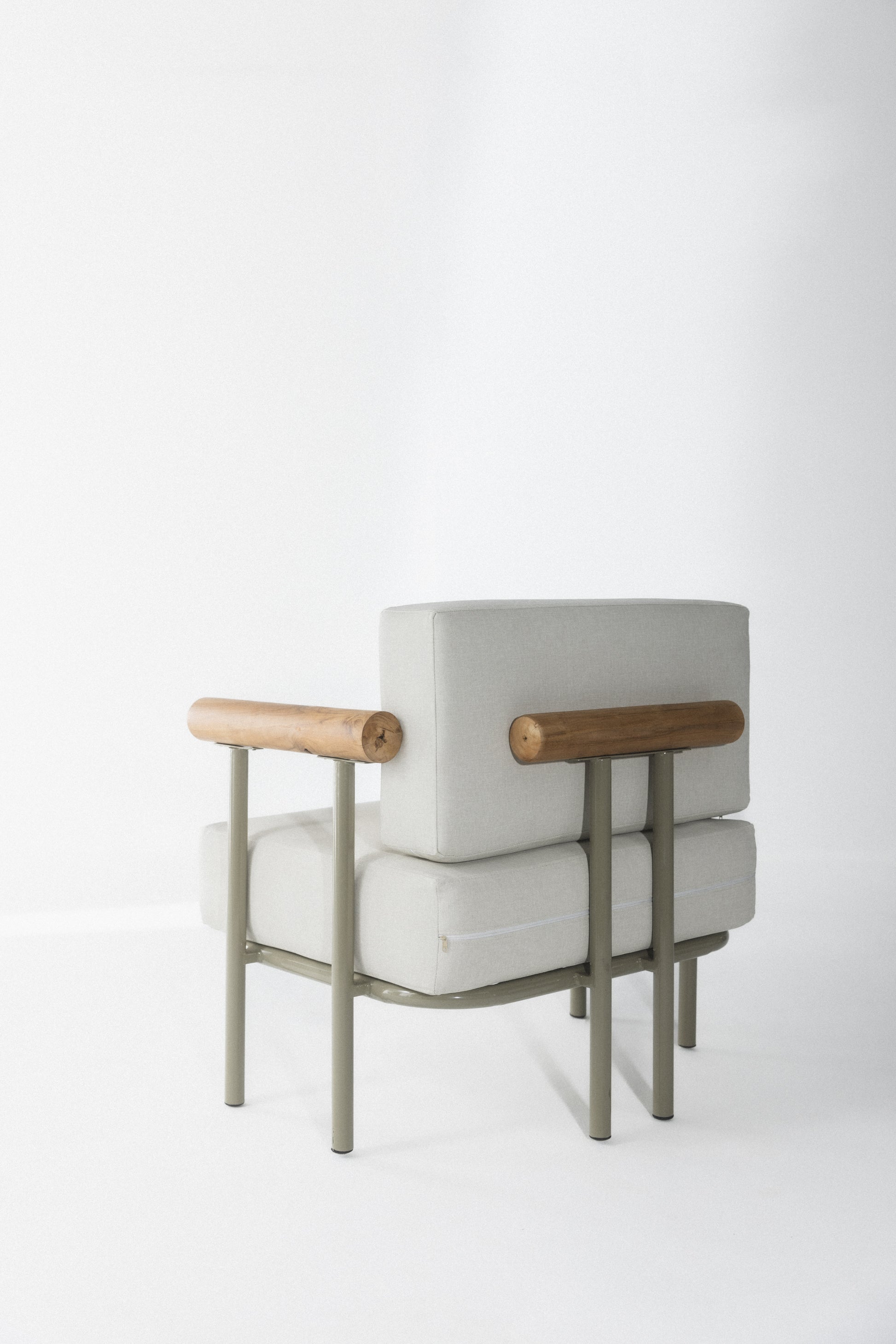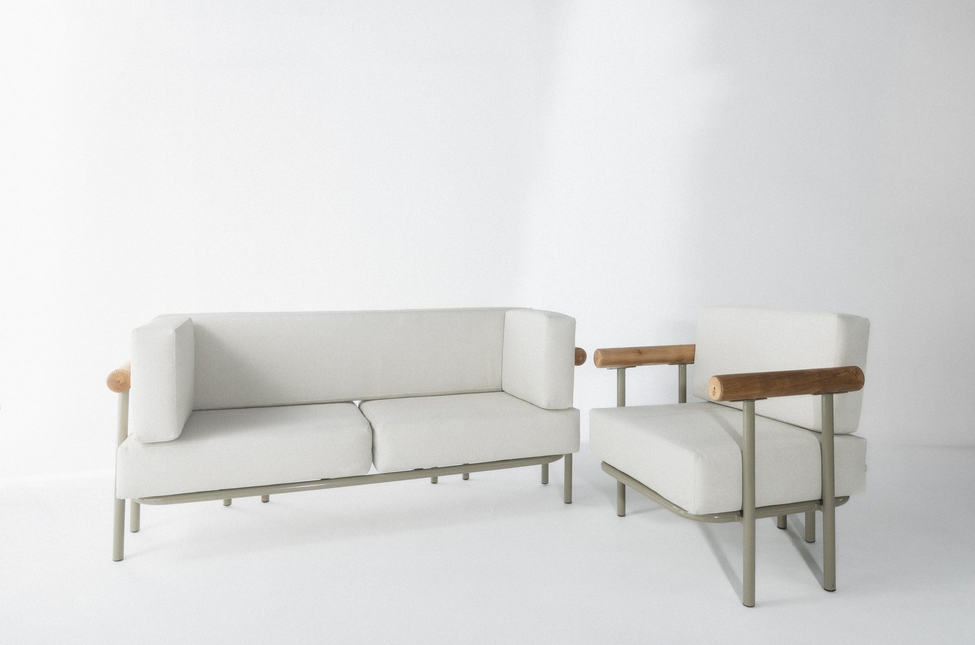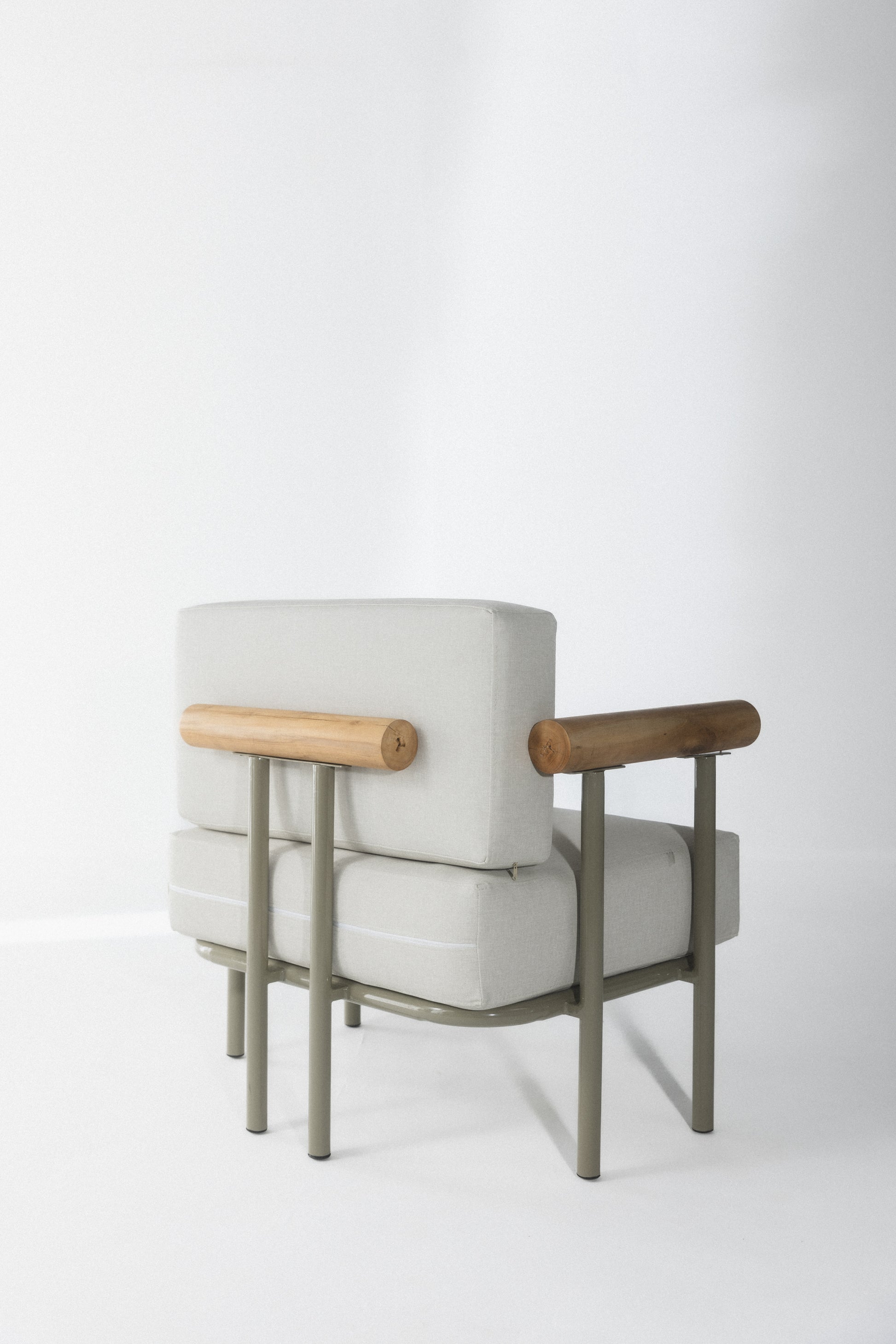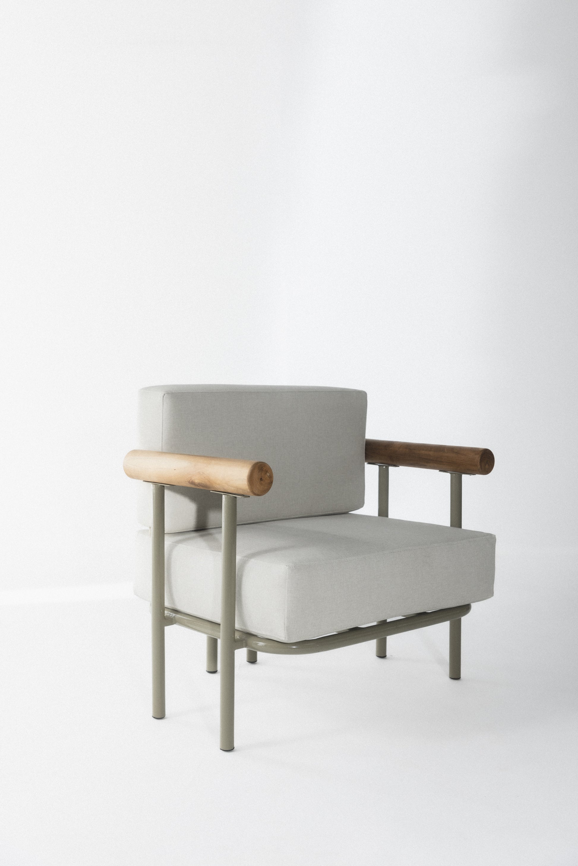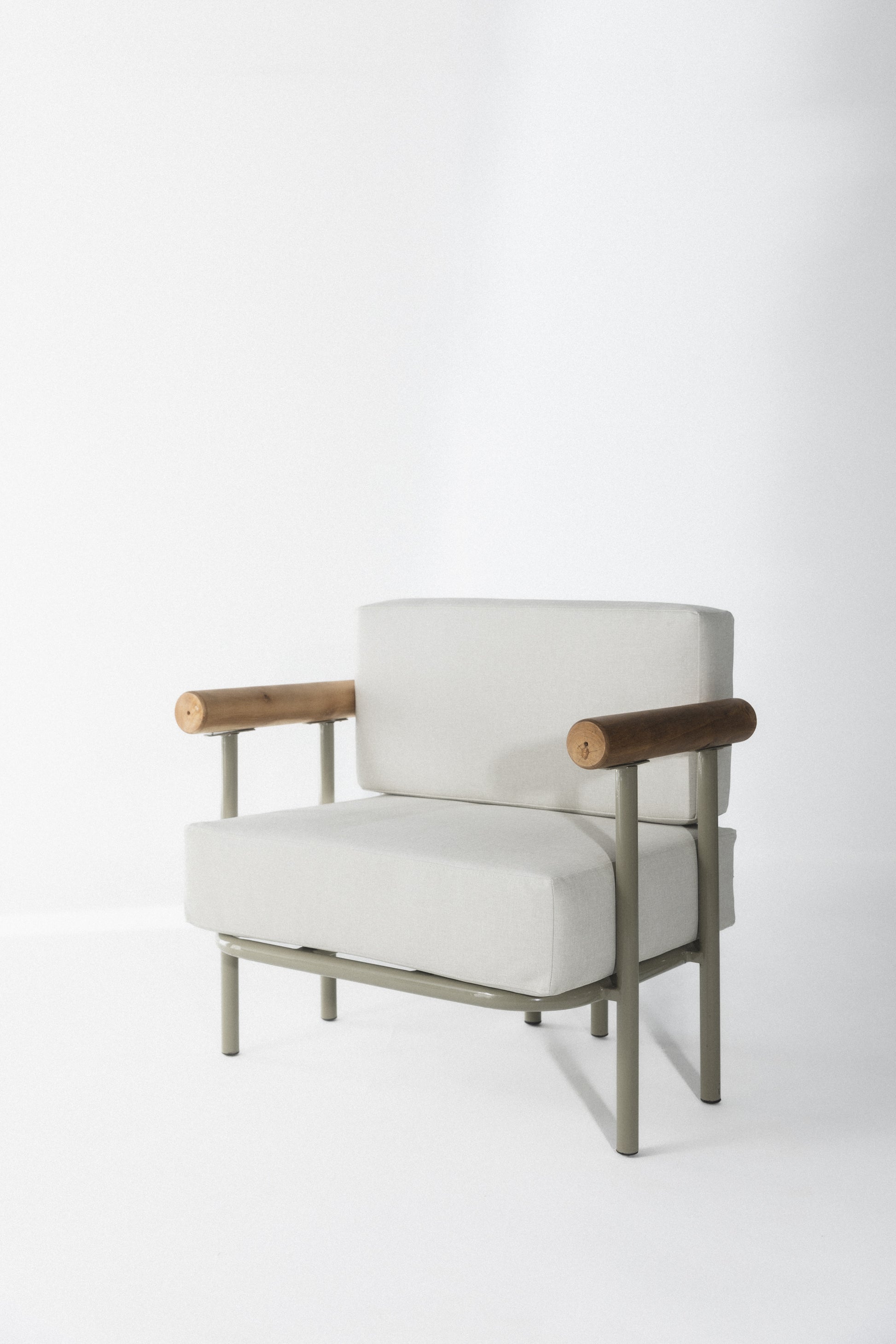 Esta poltrona para exterior combina un diseño sofisticado con materiales resistentes, perfecta para disfrutar de la comodidad en jardines, terrazas, patios o balcones. Su estructura sólida y sus brazos en madera teca aportan un estilo cálido y acogedor, ideal para cualquier espacio al aire libre.